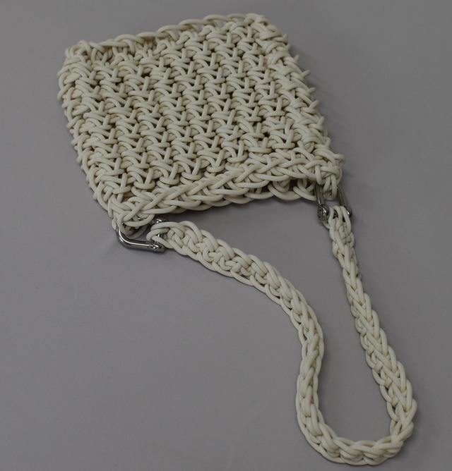 shoulder bag 【white】 ___________________________ 【テーマ】 『unchanging』 変わらず、静かにそこにあるモノ ___________________________ 【商品説明】 必須アイテムの入る容量のショルダーバッグです。 洋服の一部になり、ユニセックスで使える商品。 バッグ自身の重み、ニットのしなりによって体に吸い付くようにフィットします。 荷物を入れても伸びることもなく、しっかりとした形状でニットならではの特徴を敢えてかき消しているため伸縮などはあまりございません。 ※一点一点手編みのため多少のズレが生じます。 ___________________________________________ ※受注生産※ 受注の生産となっております。 1週間以内での発送とさせていただきます。 ___________________________________________ Color White Material rubber Made in Japan Size One size 【 Fit 】 平置き 縦 15cm 横 25cm ショルダー紐 80cm(要望ございましたら長さ延長、短縮可能です。) ___________________________________________ ※ 不良品以外は返品交換不可です。 いかなる場合でもご注文後のキャンセルはお受けいたしかねます。 ※ モニターの環境や撮影時の照明によって実物と多少色合いが異なる場合がございます。 ご了承の上お買い求めください。 ※ハンドメイドのため多少の歪みやズレが生じる場合がございます。